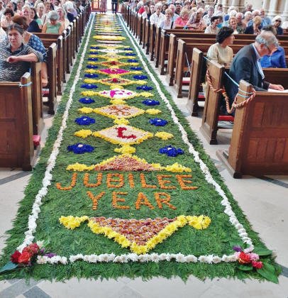 Carpet of Flowers 2025Thecarpetofflowersisdesignedtobe enjoyed,buthasadeepermeaning.The flowerspavethewayforChrist,theKingof Kings,tobecarriedbytheBishopashewalks withtheBlessedSacrament,thecelebrationof theBodyandBloodofChristwithbreadand wine.Thebeautyoftheflowersandtheskill thatwentintodesigningandlayingthecarpet offlowersaresacrificedtoGod, acknowledgingthatHeistheMasterandLord of all creation.Clickthislinktoseehowthe2025carpetwas made–https://arundelcathedral.uk/view-corpus-christi-drone-and-floral-displays-2025AstheCathedralcelebrated150yrsin2023, BBCcamerasfilmedthe‘CorpusChristi’ servicefortheir‘SongsofPraise’programme. Someofourchildrencouldbeseeninthat programme.Towatchanexcerptfromtheprogramme followthislink- https://www.bbc.co.uk/programmes/p0fzc5bp